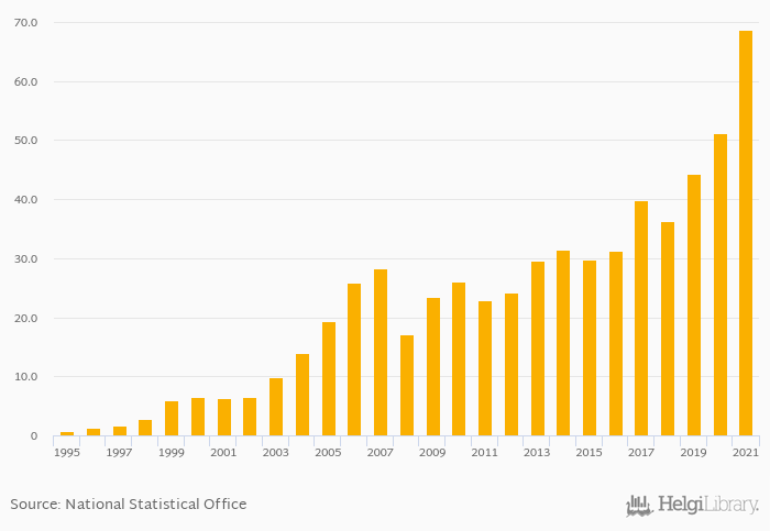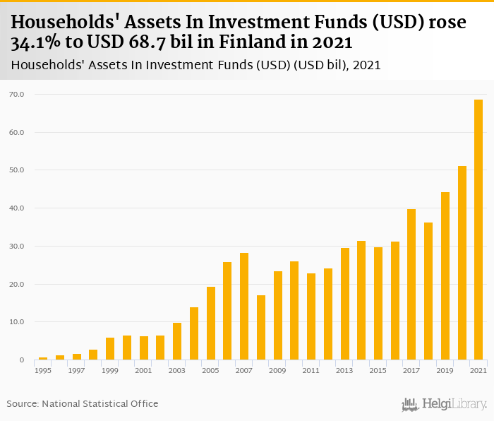 Historically, households' assets in investment funds in Finland reached an all time high of USD 68.7 bil in 2021 and an all time low of USD 0.767 bil in 1995.