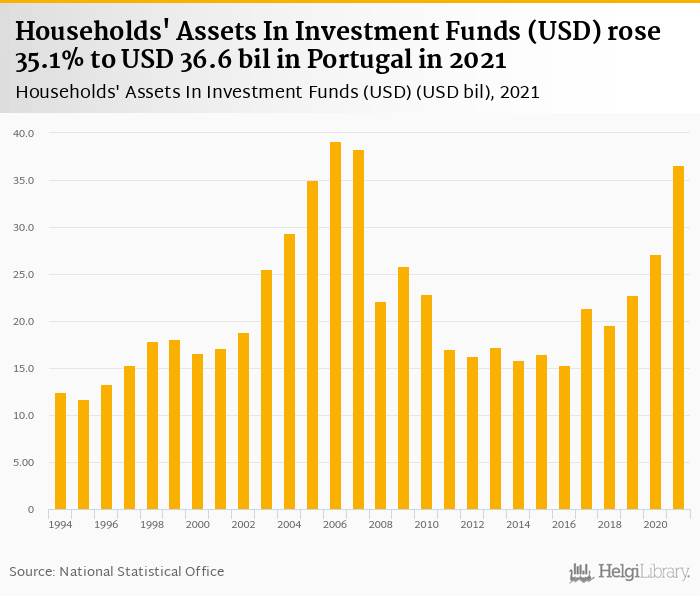 Households' assets in investment funds rose 35.1% to USD 36.6 bil in Portugal in 2021, according to OECD.
