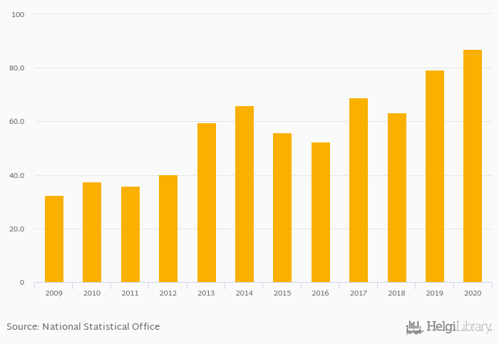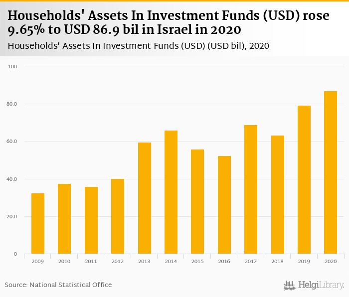 Historically, households' assets in investment funds in Israel reached an all time high of USD 86.9 bil in 2020 and an all time low of USD 32.4 bil in 2009.