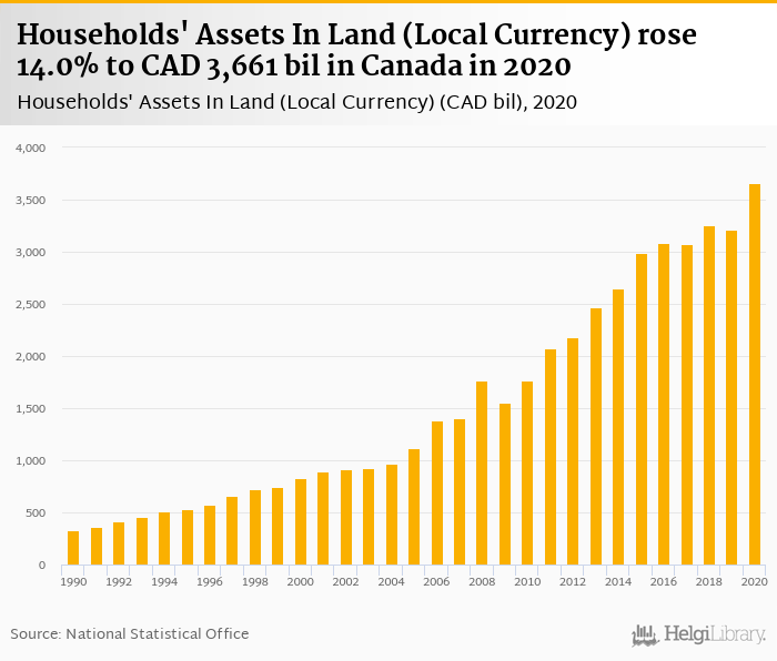 Households' assets in land rose 14.0% to CAD 3,661 bil in Canada in 2020, according to OECD.