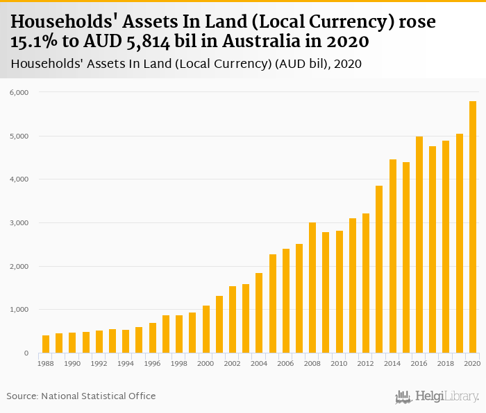 Households' assets in land rose 15.1% to AUD 5,814 bil in Australia in 2020, according to OECD.