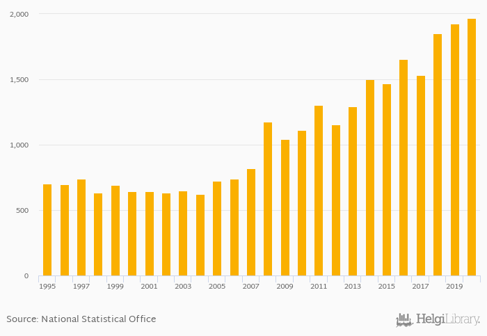Historically, households' assets in land in Czechia reached an all time high of CZK 1,966 bil in 2020 and an all time low of CZK 625 bil in 2004.