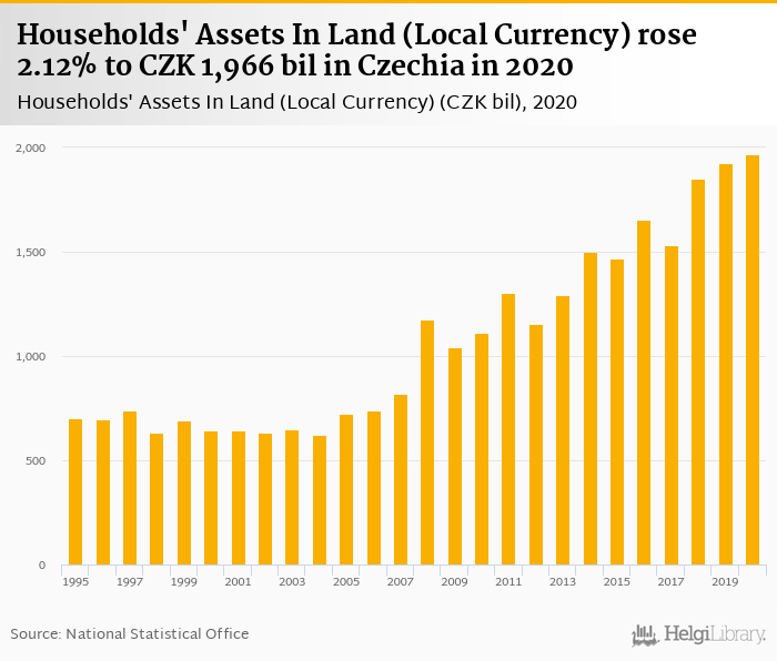 Households' assets in land rose 2.12% to CZK 1,966 bil in Czechia in 2020, according to OECD.