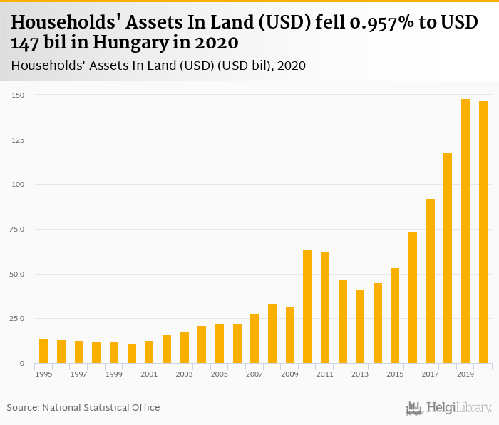 Households' assets in land fell 0.957% to USD 147 bil in Hungary in 2020, according to OECD.