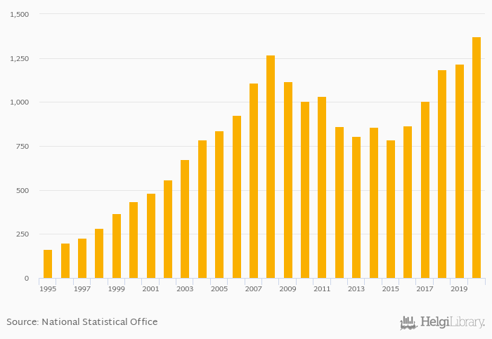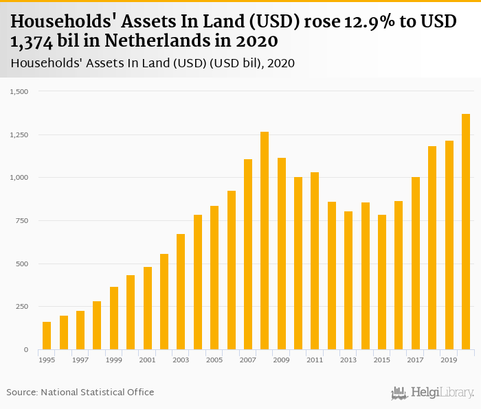 Households' assets in land rose 12.9% to USD 1,374 bil in Netherlands in 2020, according to OECD.