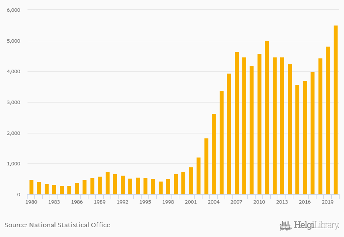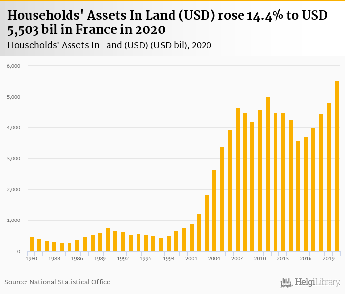 Households' assets in land rose 14.4% to USD 5,503 bil in France in 2020, according to OECD.