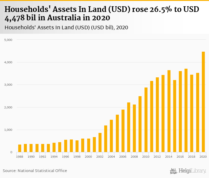 Households' assets in land rose 26.5% to USD 4,478 bil in Australia in 2020, according to OECD.