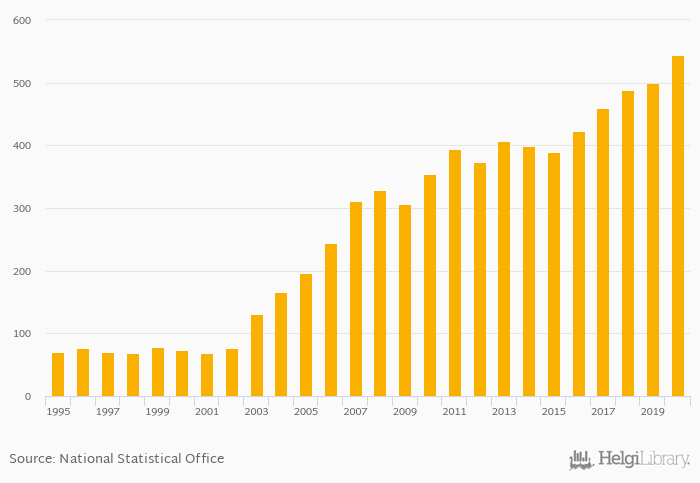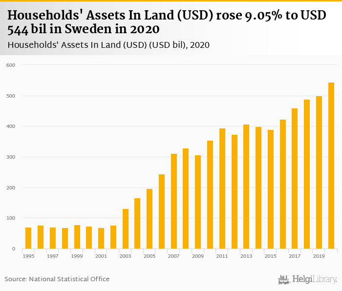 Households' assets in land rose 9.05% to USD 544 bil in Sweden in 2020, according to OECD.