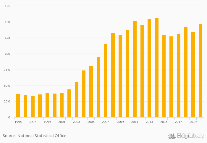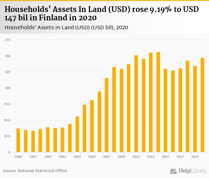 Households' assets in land rose 9.19% to USD 147 bil in Finland in 2020, according to OECD.