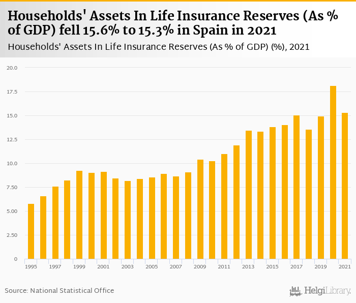 Historically, households' assets in life insurance reserves as of GDP in Spain reached an all time high of 18.2% in 2020 and an all time low of 5.79% in 1995.