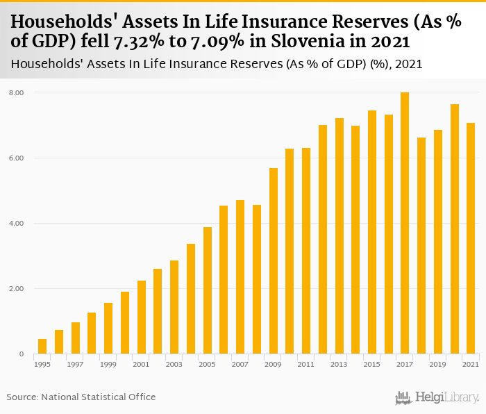 Historically, households' assets in life insurance reserves as of GDP in Slovenia reached an all time high of 7.99% in 2017 and an all time low of 0.478% in 1995.