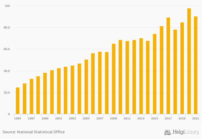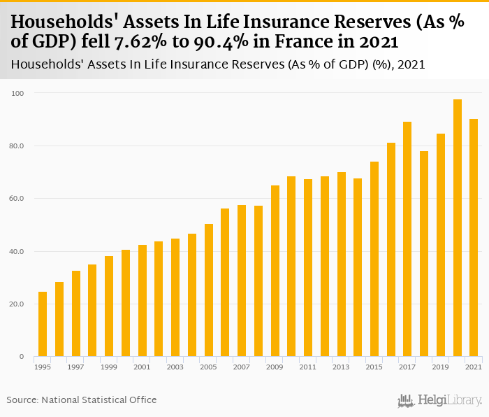 Households' assets in life insurance reserves as of GDP fell 7.62% to 90.4% in France in 2021, according to OECD.
