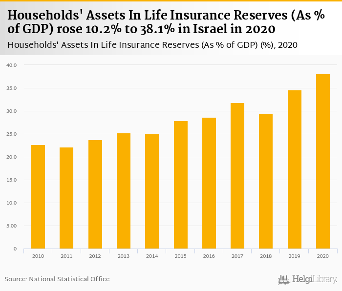 Households' assets in life insurance reserves as of GDP rose 10.2% to 38.1% in Israel in 2020, according to OECD.