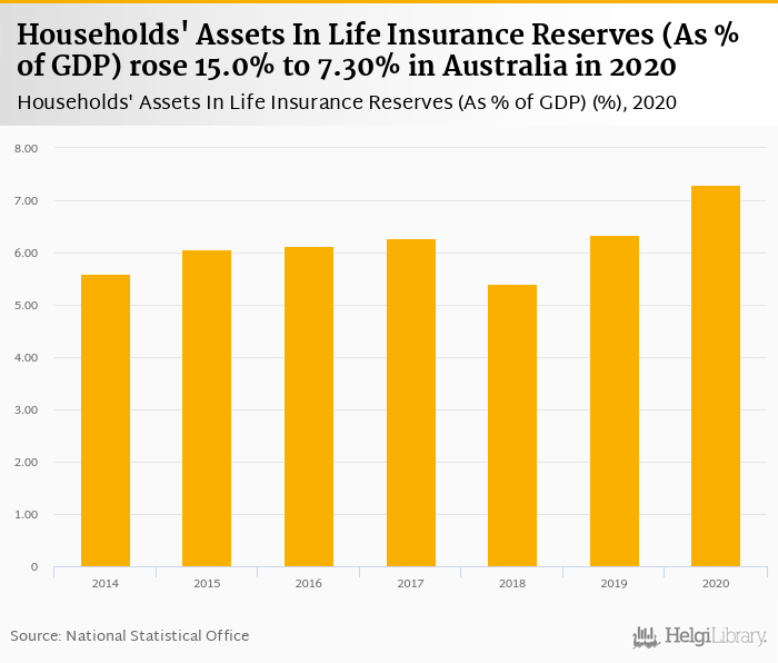 Households' assets in life insurance reserves as of GDP rose 15.0% to 7.30% in Australia in 2020, according to OECD.
