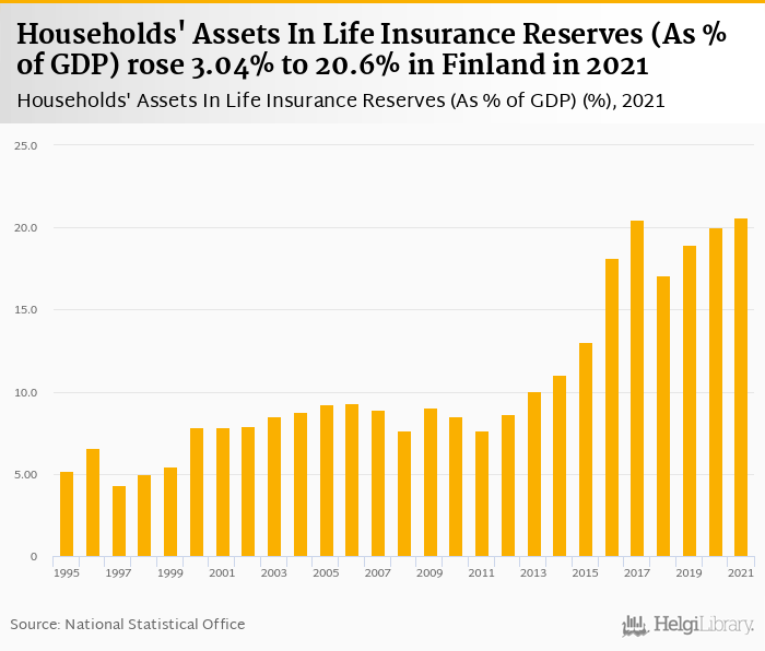 Historically, households' assets in life insurance reserves as of GDP in Finland reached an all time high of 20.6% in 2021 and an all time low of 4.29% in 1997.