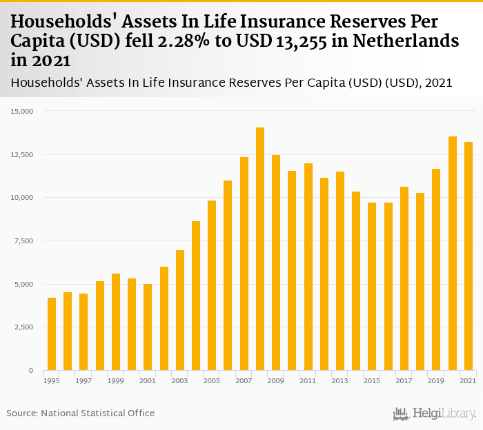 Households' assets in life insurance reserves per capita fell 2.28% to USD 13,255 in Netherlands in 2021, according to OECD.