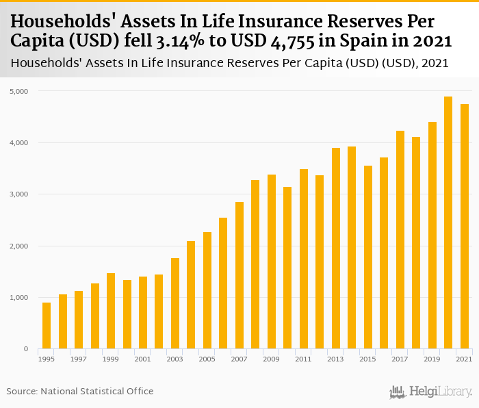 Households' assets in life insurance reserves per capita fell 3.14% to USD 4,755 in Spain in 2021, according to OECD.
