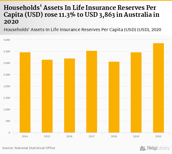 Households' assets in life insurance reserves per capita rose 11.3% to USD 3,863 in Australia in 2020, according to OECD.