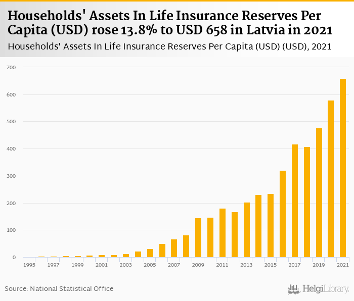Households' assets in life insurance reserves per capita rose 13.8% to USD 658 in Latvia in 2021, according to OECD.