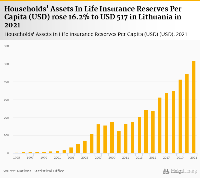 Households' assets in life insurance reserves per capita rose 16.2% to USD 517 in Lithuania in 2021, according to OECD.
