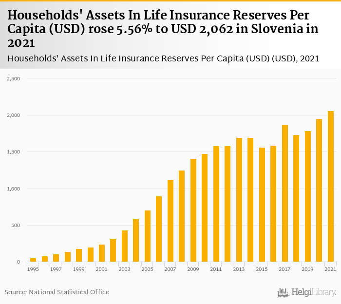 Households' assets in life insurance reserves per capita rose 5.56% to USD 2,062 in Slovenia in 2021, according to OECD.