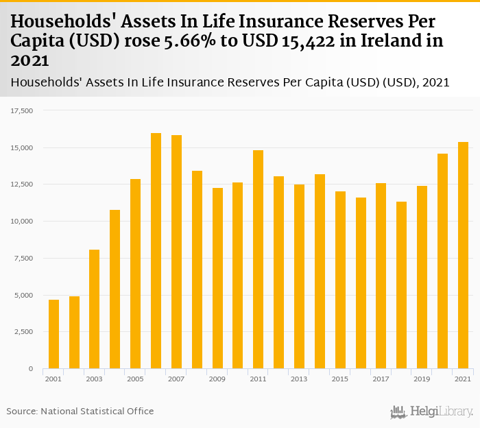 Households' assets in life insurance reserves per capita rose 5.66% to USD 15,422 in Ireland in 2021, according to OECD.