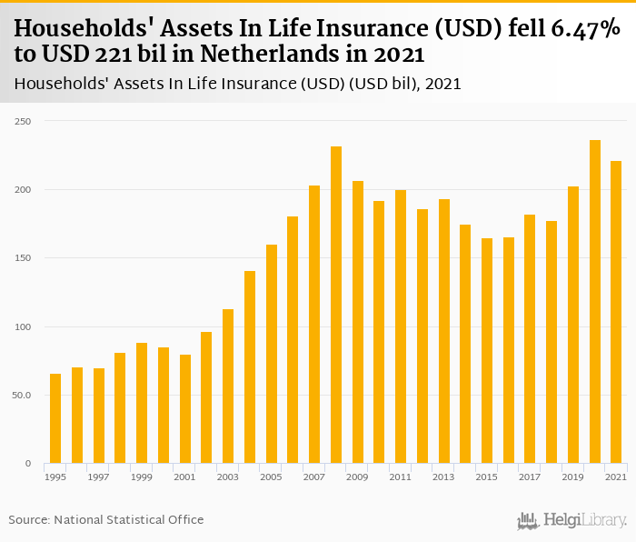 Households' assets in life insurance fell 6.47% to USD 221 bil in Netherlands in 2021, according to OECD.