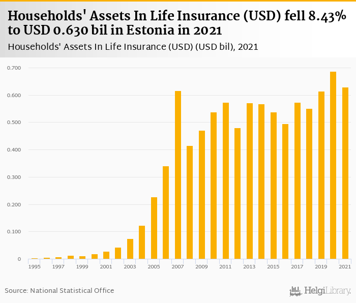 Households' assets in life insurance fell 8.43% to USD 0.630 bil in Estonia in 2021, according to OECD.
