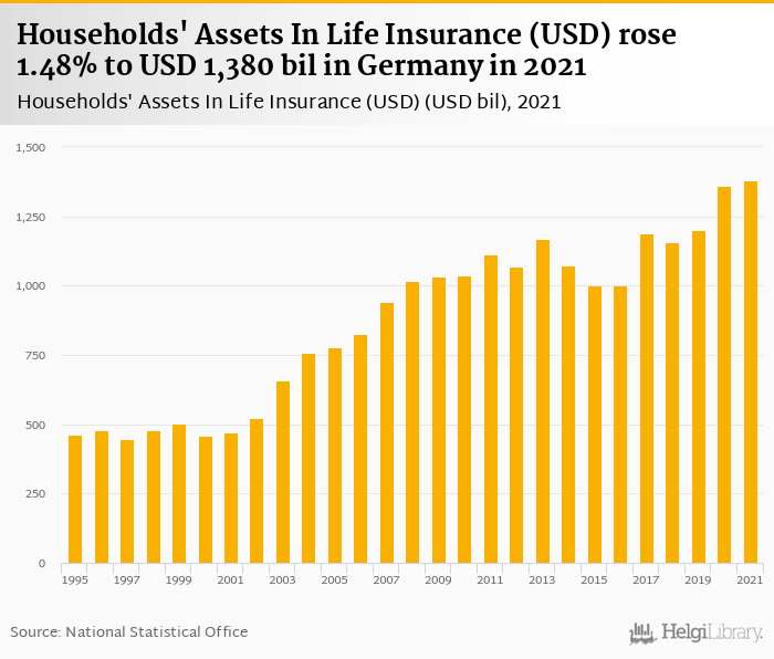 Households' assets in life insurance rose 1.48% to USD 1,380 bil in Germany in 2021, according to OECD.