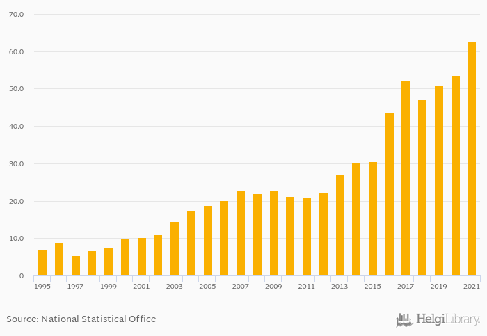 Historically, households' assets in life insurance in Finland reached an all time high of USD 62.5 bil in 2021 and an all time low of USD 5.46 bil in 1997.