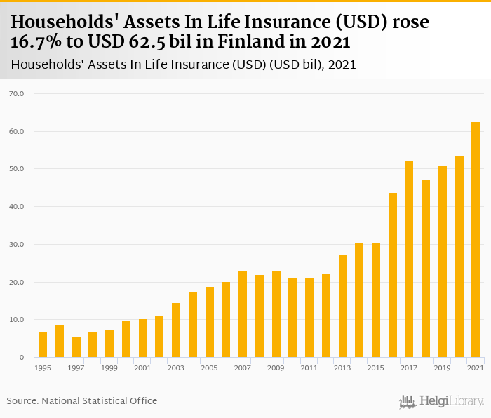 Households' assets in life insurance rose 16.7% to USD 62.5 bil in Finland in 2021, according to OECD.