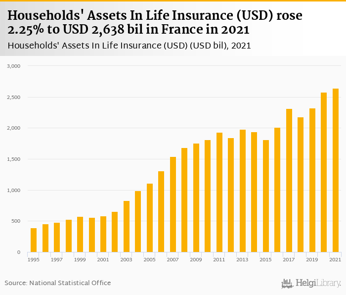 Households' assets in life insurance rose 2.25% to USD 2,638 bil in France in 2021, according to OECD.