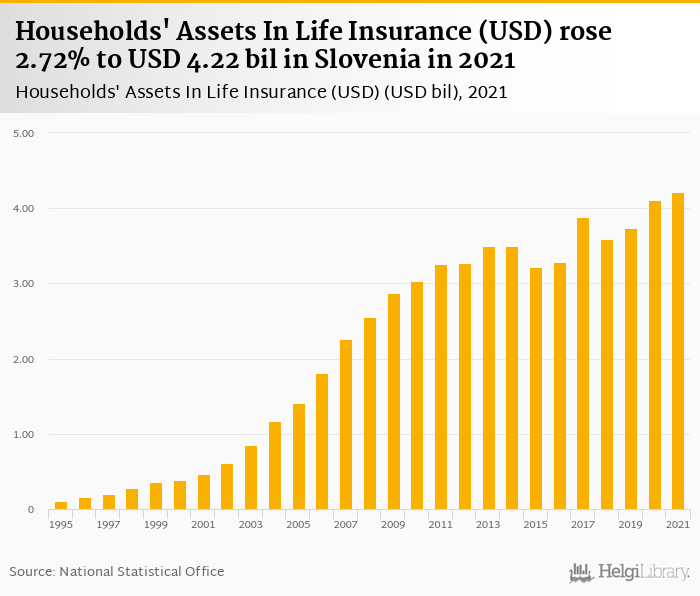 Households' assets in life insurance rose 2.72% to USD 4.22 bil in Slovenia in 2021, according to OECD.