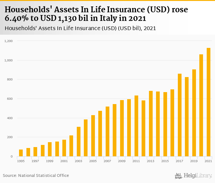 Households' assets in life insurance rose 6.40% to USD 1,130 bil in Italy in 2021, according to OECD.