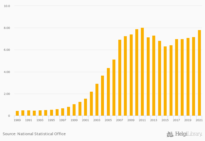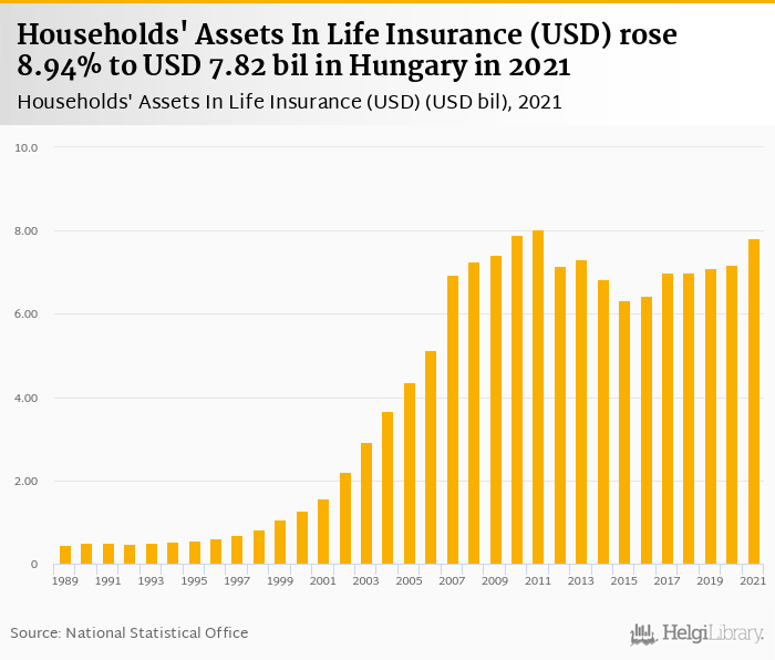 Households' assets in life insurance rose 8.94% to USD 7.82 bil in Hungary in 2021, according to OECD.
