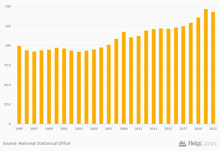 Historically, households' dwellings assets as of GDP in Finland reached an all time high of 147% in 2020 and an all time low of 92.3% in 2003.