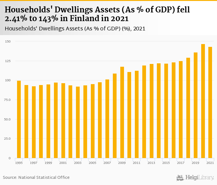 Households' dwellings assets as of GDP fell 2.41% to 143% in Finland in 2021, according to OECD.