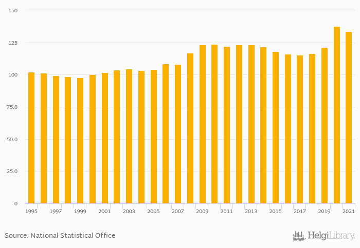 Historically, households' dwellings assets as of GDP in Belgium reached an all time high of 137% in 2020 and an all time low of 97.9% in 1999. When compared to Belgium's main peers, households' dwellings assets as of GDP in France amounted to 176%, 151% in Germany, 53.0% in Luxembourg and 108% in Netherlands in 2021.