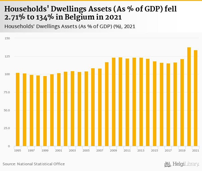 Households' dwellings assets as of GDP fell 2.71% to 134% in Belgium in 2021, according to OECD.