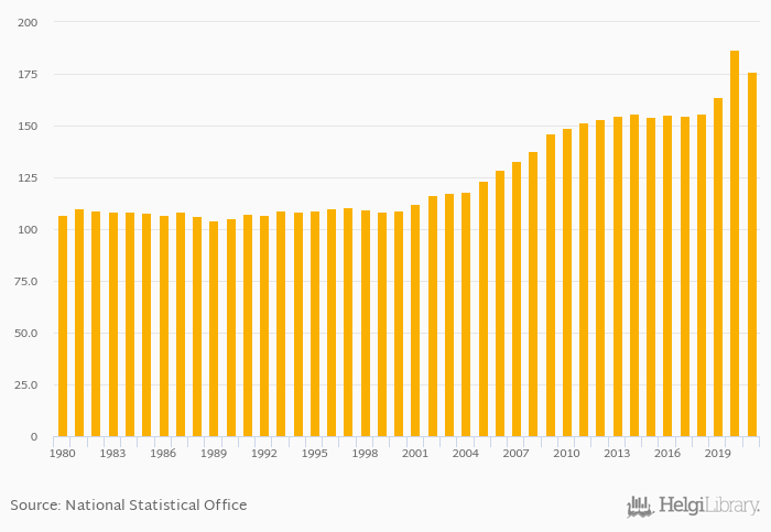 Historically, households' dwellings assets as of GDP in France reached an all time high of 187% in 2020 and an all time low of 104% in 1989.
