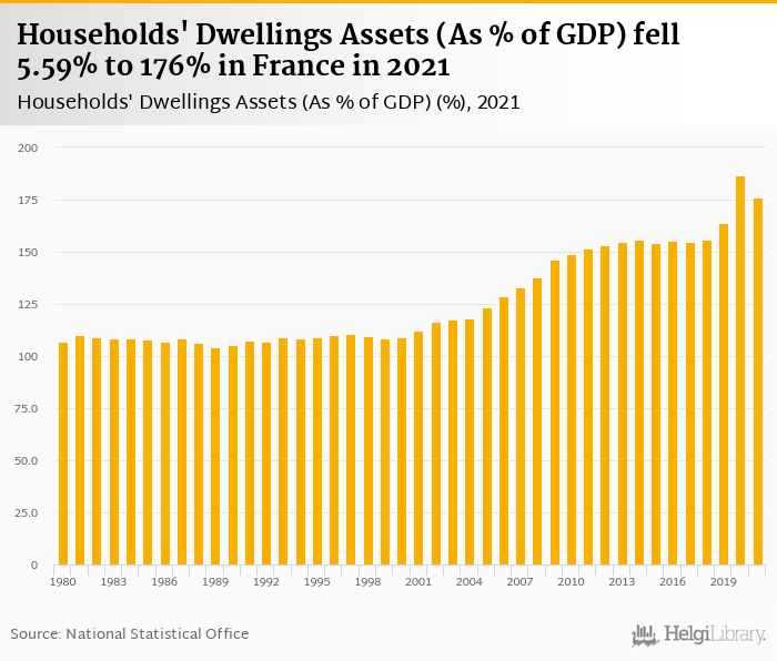 Households' dwellings assets as of GDP fell 5.59% to 176% in France in 2021, according to OECD.