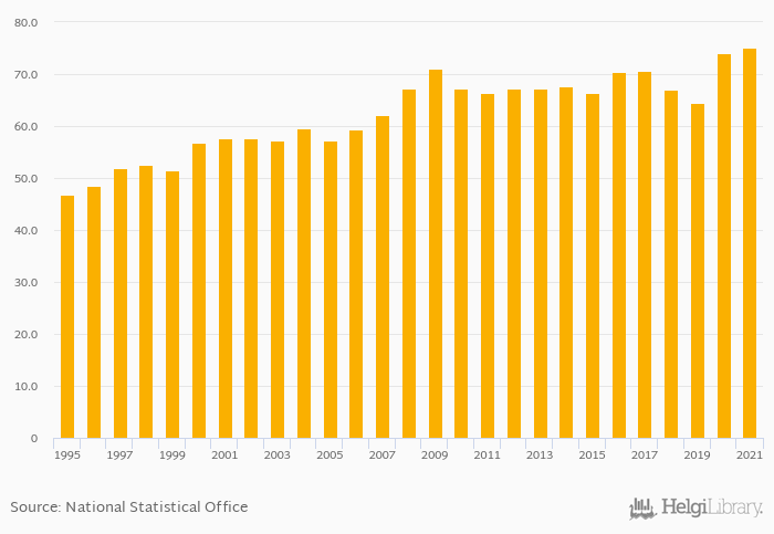 Historically, households' dwellings assets as of GDP in Sweden reached an all time high of 75.1% in 2021 and an all time low of 46.8% in 1995.