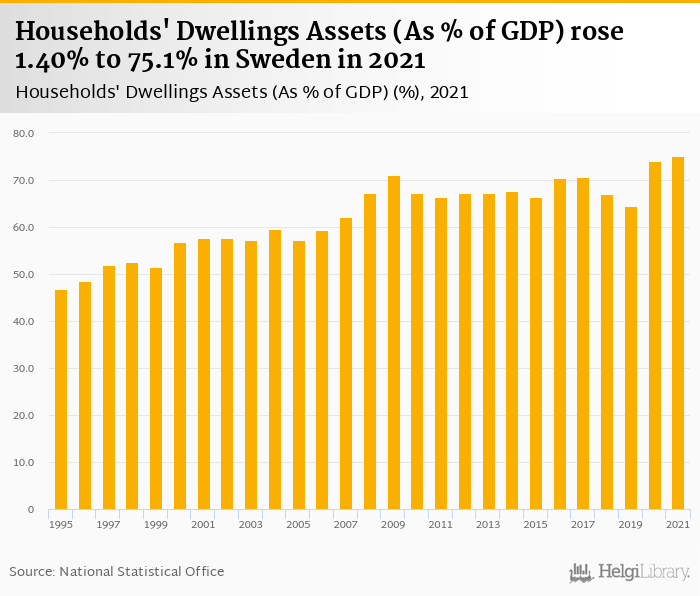 Households' dwellings assets as of GDP rose 1.40% to 75.1% in Sweden in 2021, according to OECD.