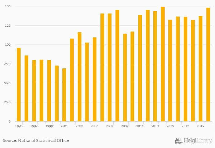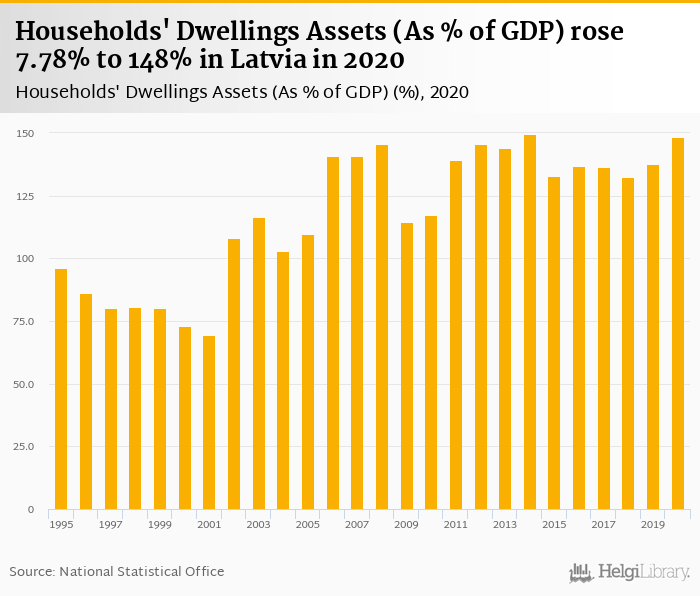 Historically, households' dwellings assets as of GDP in Latvia reached an all time high of 149% in 2014 and an all time low of 69.4% in 2001.