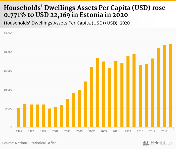 Households' dwellings assets per capita rose 0.771% to USD 22,169 in Estonia in 2020, according to OECD.