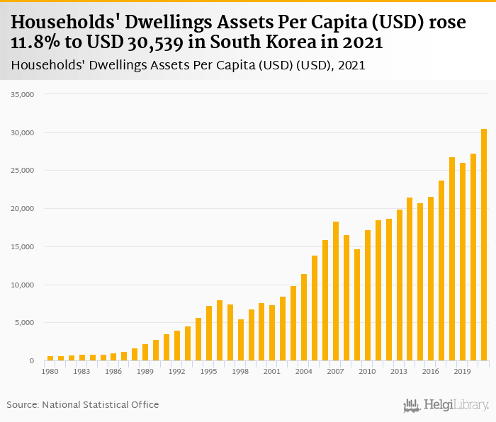 Households' dwellings assets per capita rose 11.8% to USD 30,539 in South Korea in 2021, according to OECD.