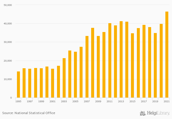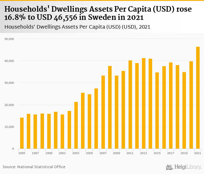 Households' dwellings assets per capita rose 16.8% to USD 46,556 in Sweden in 2021, according to OECD.