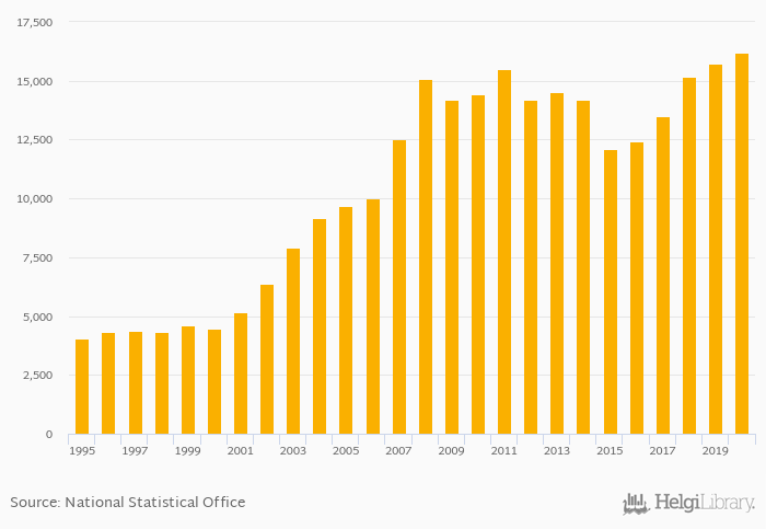 Historically, households' dwellings assets per capita in Hungary reached an all time high of USD 16,215 in 2020 and an all time low of USD 4,050 in 1995.