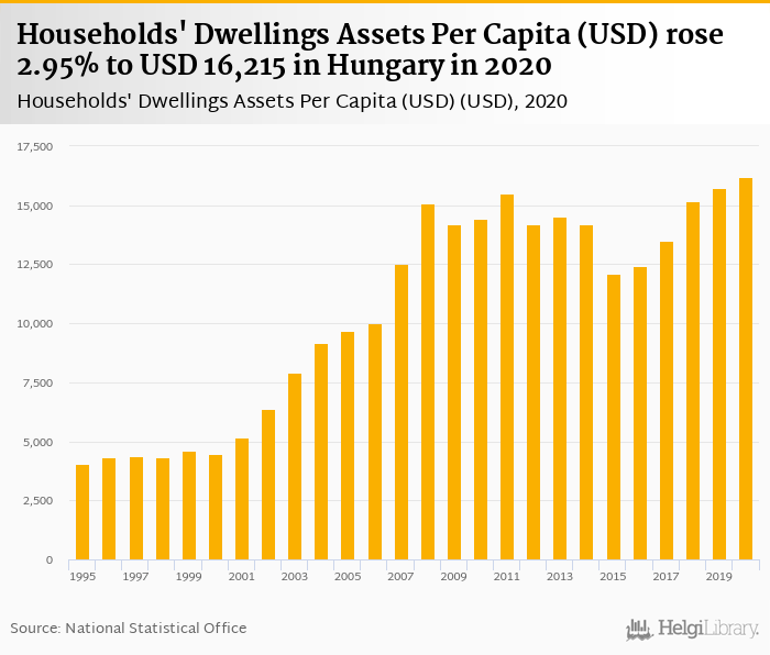 Households' dwellings assets per capita rose 2.95% to USD 16,215 in Hungary in 2020, according to OECD.