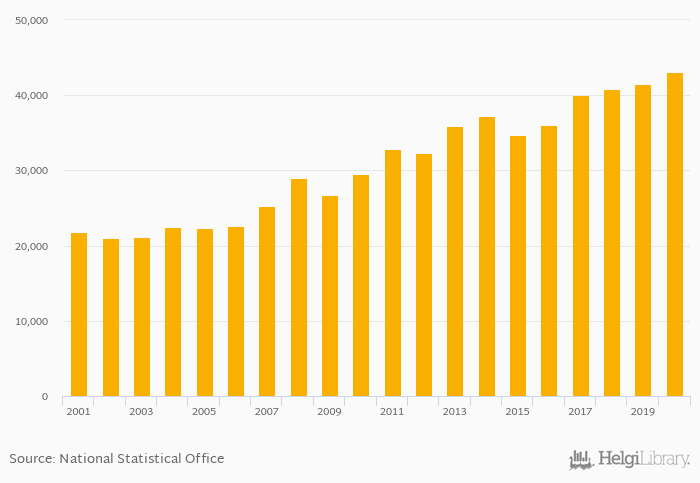 Historically, households' dwellings assets per capita in Israel reached an all time high of USD 43,066 in 2020 and an all time low of USD 21,070 in 2002.